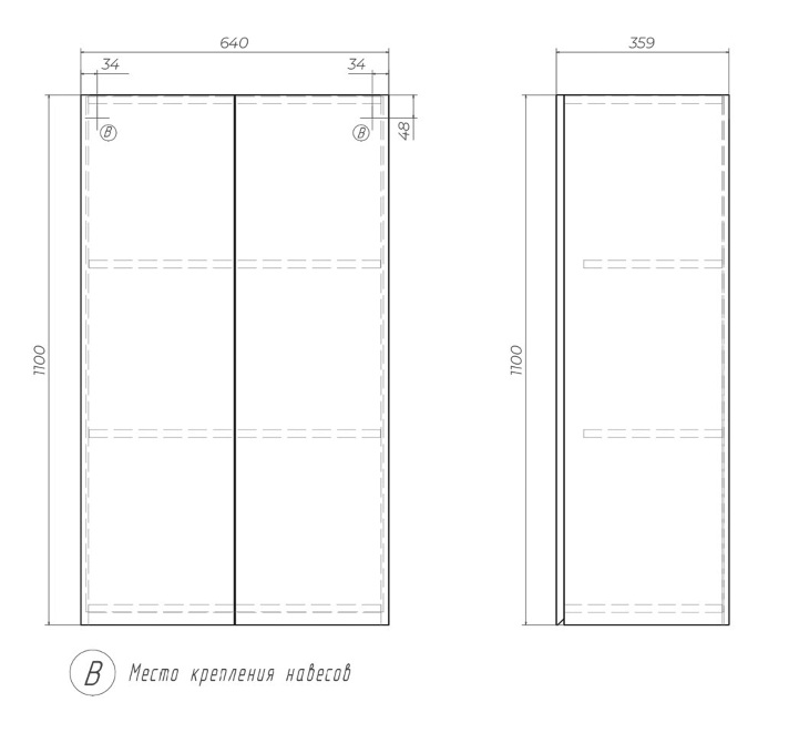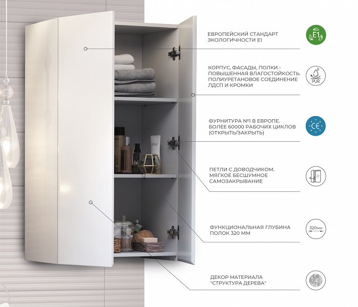 Оснащение: 2 дверцы; 2 полки ЛДСП; интегрированная ручка, 2 навеса