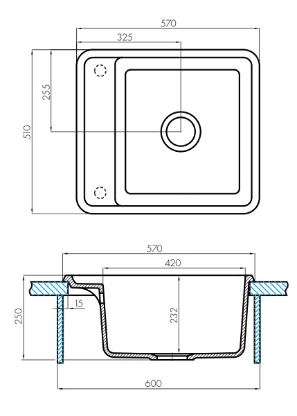 Комплектация: мойка, слив Ø90 мм с переливом