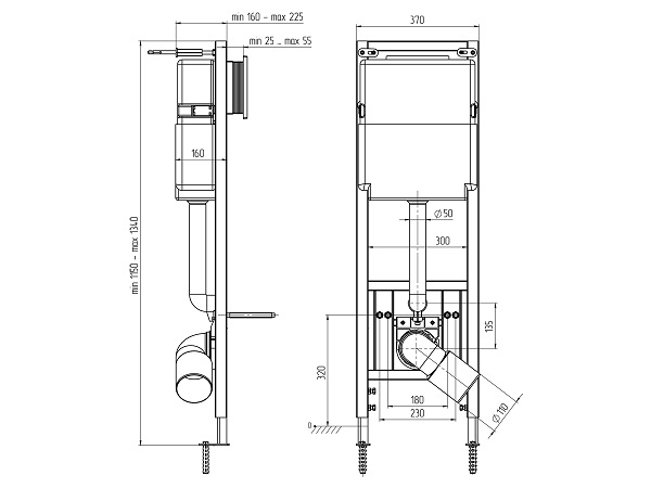 • Размеры инсталляции (В х Ш х Г) мм. - 1150–1350 (регулируемая) х 370 х 160-225 (регулируемая)