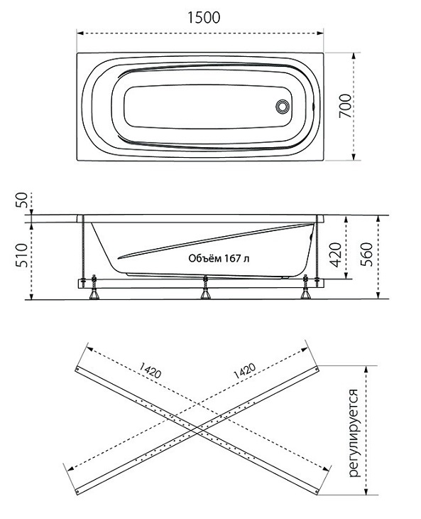 Каркас усиленный для прямоугольных ванн 140-170х70-75, универсальный, 5 опор (ТРИТОН)