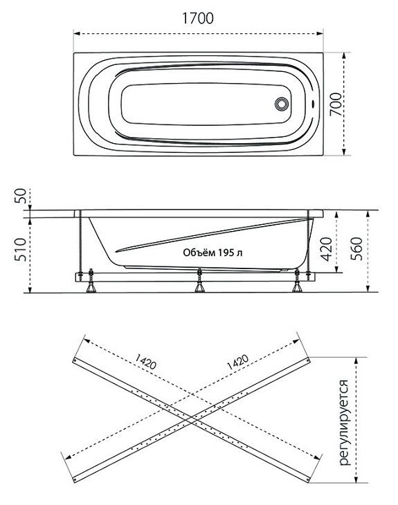 Каркас усиленный для прямоугольных ванн 170-190х70-90 универсальный, 5 опор (ТРИТОН)